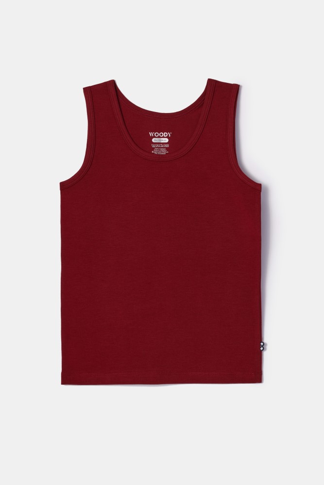 Woody singlet voor jongens in donkerrood soepel en rekbaar katoen. Dit onderlijfje draag je onder een trui, T-shirt of pyjama. Verkrijgbaar in de maten 24m/2y-16y.