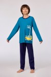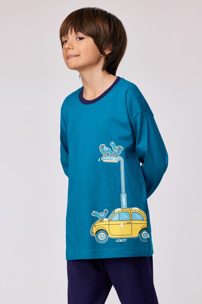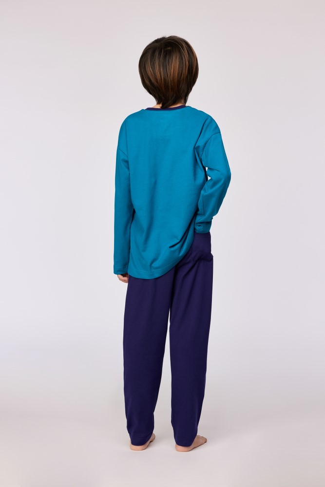 Pyjama van 100% katoen. Het bovenstuk is groenblauw met een grote print in duiventhema. De broek is donkerblauw zoals de hals van de shirt. De pyjama is verkrijgbaar in de maten 24m/2y-XXL en heeft een schoudersluiting bij de maten 0-18m.