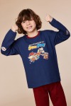 Pyjama van 100% katoen. Het bovenstuk is donkerblauw en heeft een grote print in ponythema. Op de mouwen, ter hoogte van de ellebogen, zijn ook nog prints te vinden in dit thema. De broek is effen donkerrood. De pyjama is verkrijgbaar in de maten 24m/2y-XXL en heeft een schoudersluiting bij de maten 0-18m.