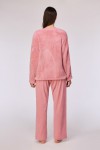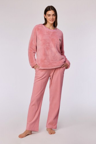 Pyjama bestaande uit een lange gele broek met kattenprint van velours, en een zachtroze trui van teddystof, met een kleine applicatie van onze Woody kat. Verkrijgbaar in de maten 24m/2y-XXL.
