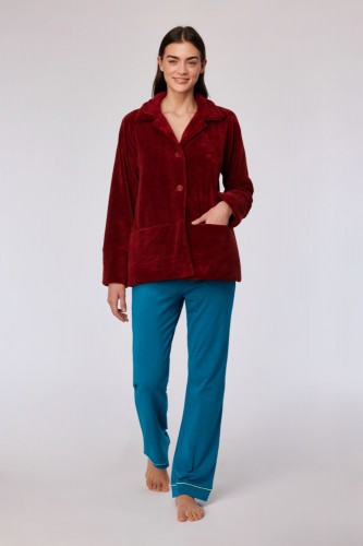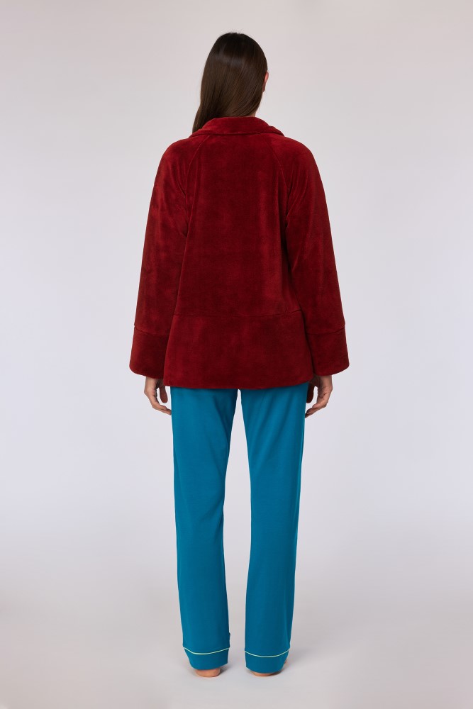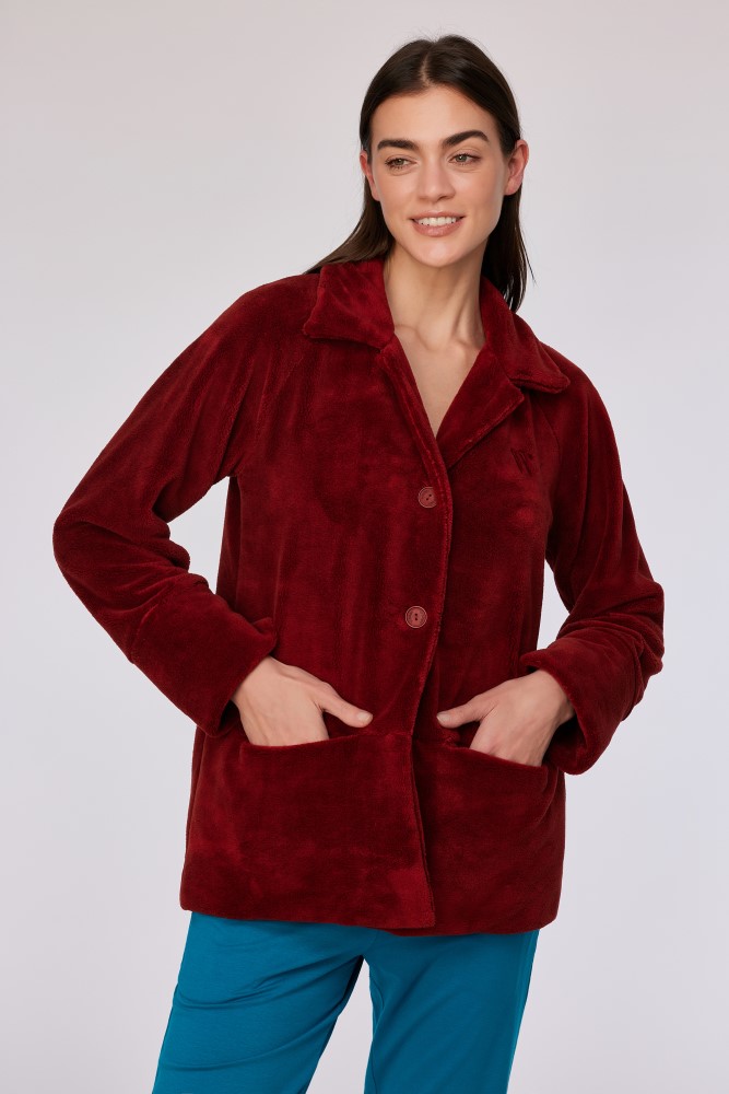 Donkerrode korte jas van fleece. De jas heeft drie knopen en is verkrijgbaar in XS-XXL.