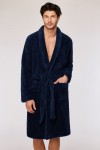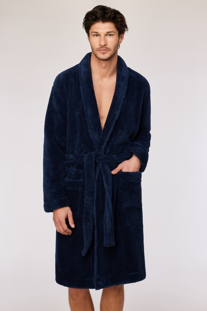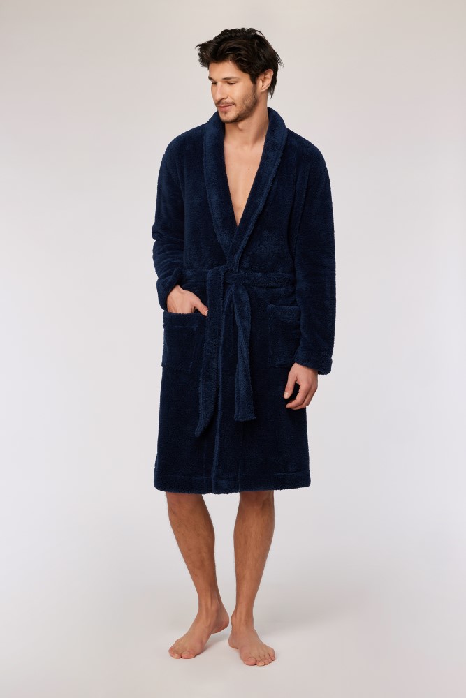 Diepblauwe kamerjas van teddystof die tot onder de knie komt. De kamerjas heeft twee zakken en een ceintuur. Verkrijgbaar in de maten S-XXL.
