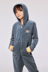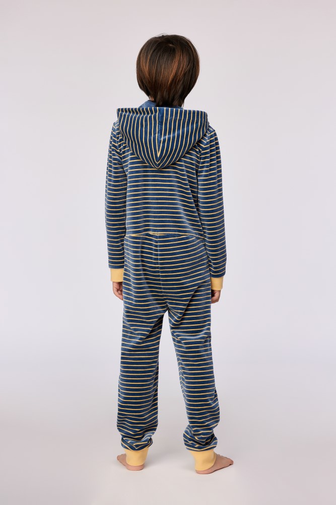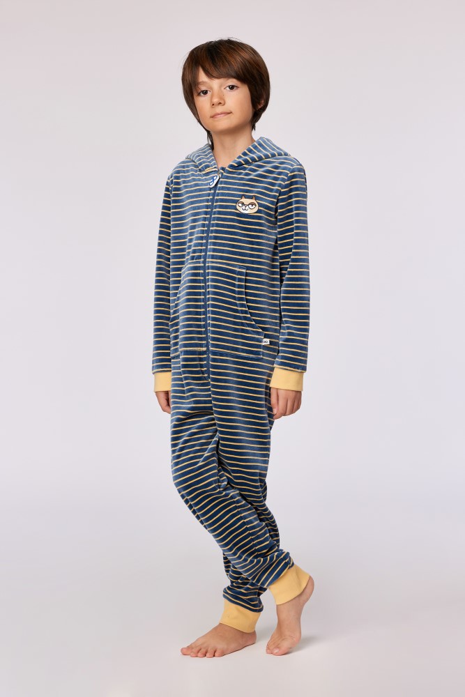 Antraciet-geel gestreepte onesie van velours. De onesie is unisex, heeft een kat op de borst en is verkrijgbaar in de maten 24m/2y-XXL.