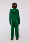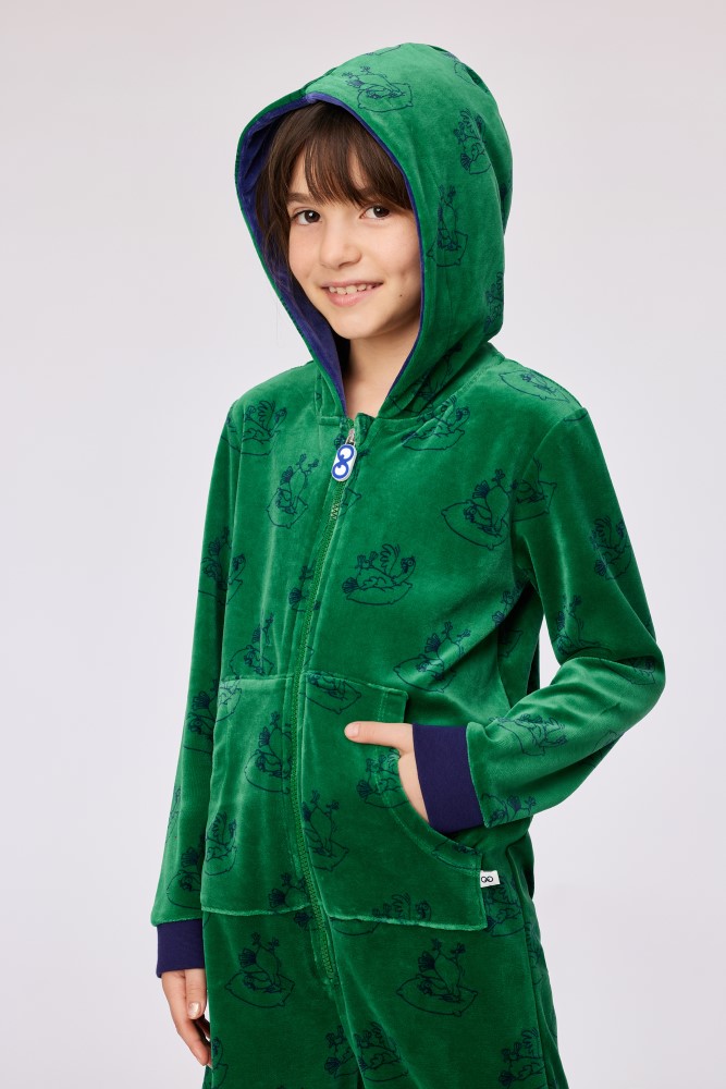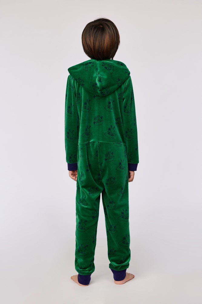 Groene unisex onesie van velours. De onesie heeft een donkerblauwe duivenprint en is verkrijgbaar in de maten 24m/2y-XXL.