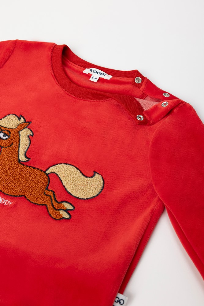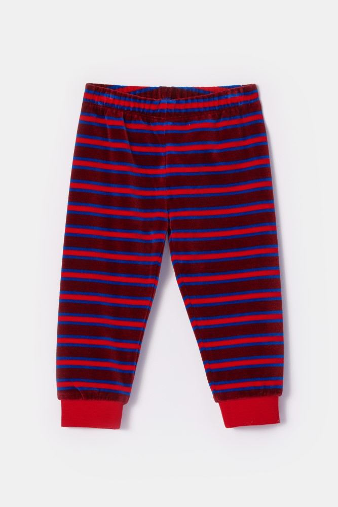 Rode pyjama van velours. Het bovenstuk is rood met een print van een pony. De broek is rood-blauw gestreept. De pyjama is verkrijgbaar in de maten 0m-XXL en heeft een schoudersluiting bij de maten 0-18m.