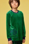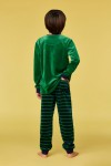 Donkergroene pyjama van velours. Het bovenstuk met de mouwboorden en hals in een contrasterende blauwe kleur heeft een print van een duif. De broek is blauw-groen gestreept. De pyjama is verkrijgbaar in de maten 0m-XXL en heeft een schoudersluiting bij de maten 0-18m.