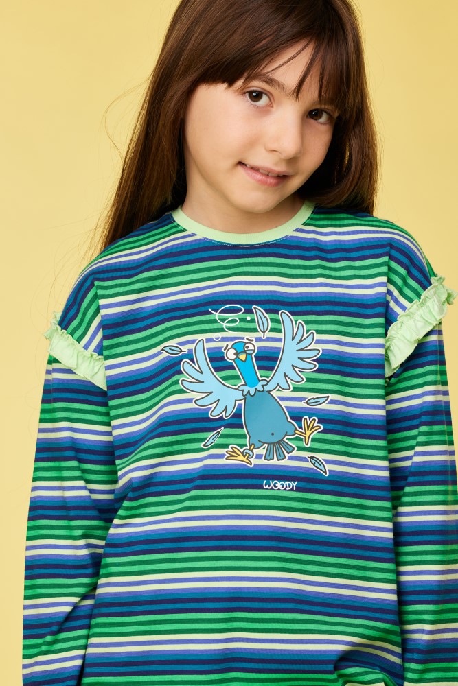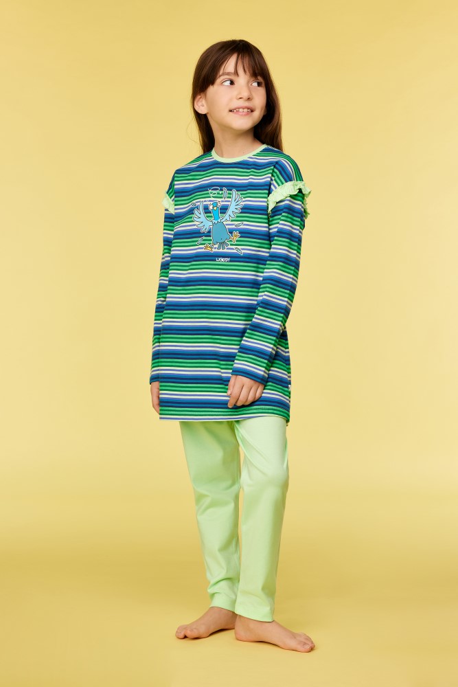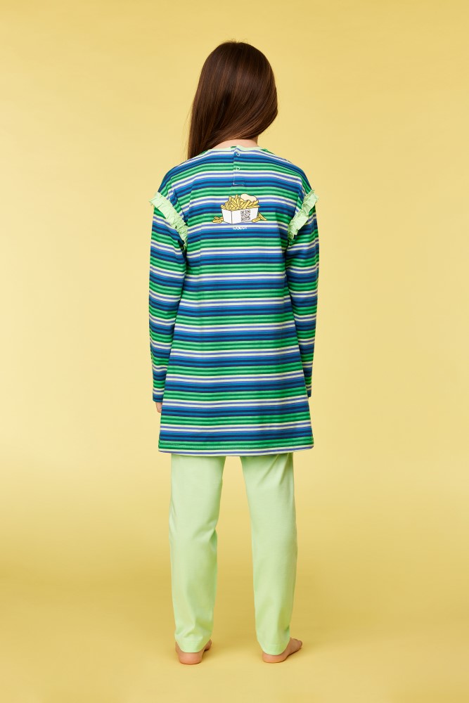 Groene pyjama van 100% katoen. De pyjama heeft een lichtgroene broek en een gestreept bovenstuk met print. Bovenaan zijn de mouwen afgewerkt met een fantasie. De pyjama is verkrijgbaar in de maten 24m/2y-XXL. Voor de maten 24m/2y-8y is er een sluiting inde rug voorzien.