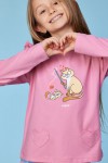 Roze pyjama van 100% katoen. Het roze bovenstuk heeft twee hartvormige zakjes, een kattenprint op de voor- en achterkant en een fantasie aan de mouwen. De broek is lichtblauw met gele en roze strepen. De pyjama is verkrijgbaar in de maten 0m-XXL. Voor dematen 0m-8y is er een sluiting in de rug voorzien.