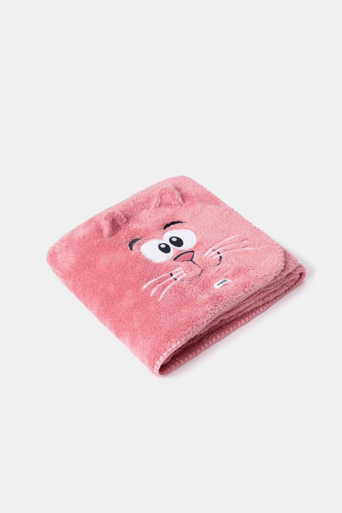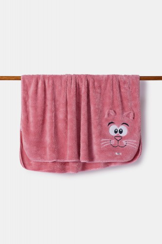 Roze plaid van teddystof. De plaid heeft een kattensnoet en is verkrijgbaar in twee formaten, 120x120cm en 150x200cm.