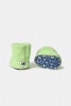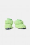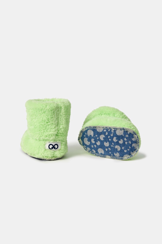 Groene pantoffels in teddystof. De pantoffels kunnen omgeplooid of lang gelaten worden. Verkrijgbaar in de maten 0-6m tot 43-46.