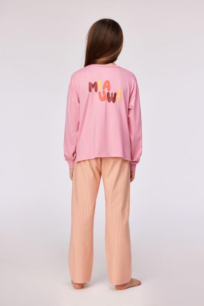 Roze winterpyjama, gemaakt van soepel katoen. Deze pyjama met sweater en lange gestreepte broek heeft een kattenprint en het opschrift 'Miauw'. Verkrijgbaar in de maten 24m/2y-XXL.