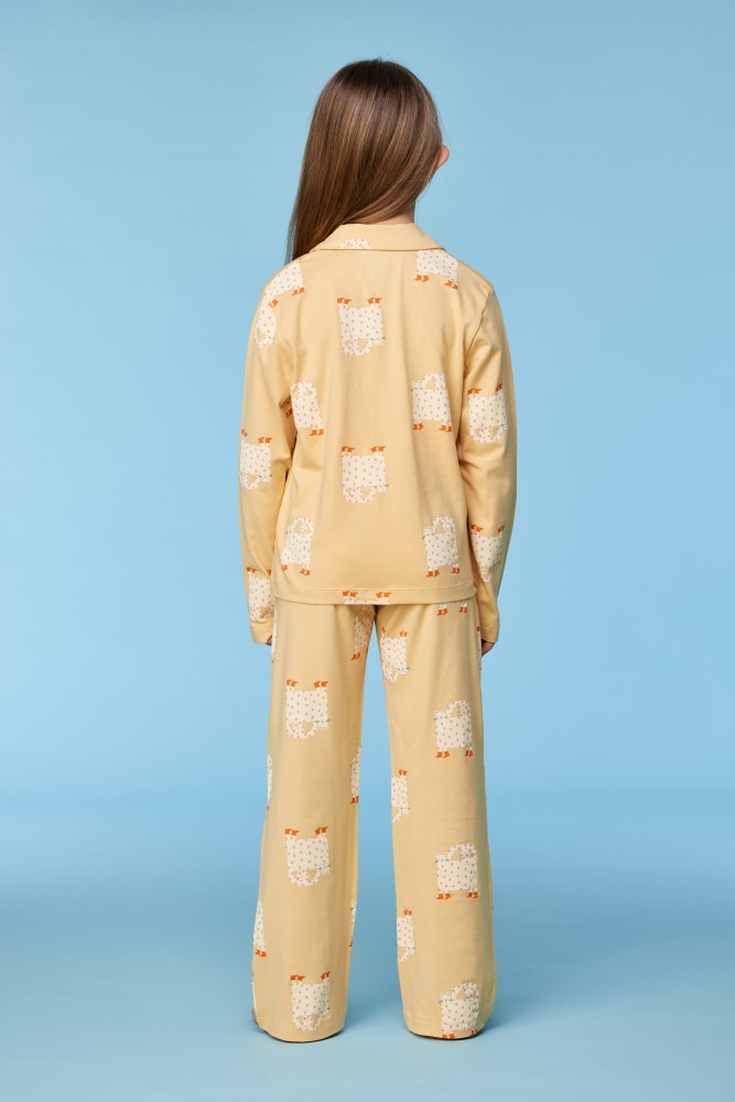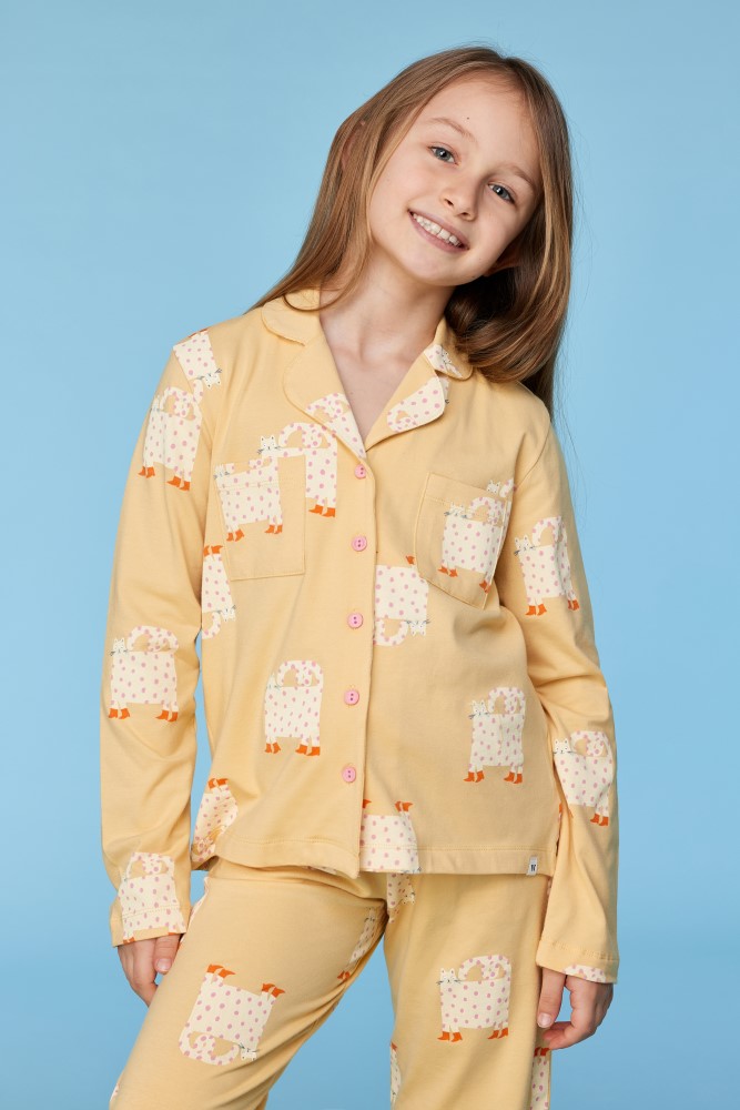 Gele winterpyjama met kattenprint, gemaakt van soepel katoen. Dit doorknoopmodel heeft een losse pasvorm. Verkrijgbaar in de maten 6y-XXL.