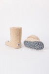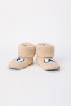Beige pantoffels in teddystof met ogen. De pantoffels kunnen omgeplooid of lang gelaten worden. Verkrijgbaar in de maten 22-26 tot 43-46.