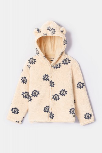 Ecru korte unisex jas van teddystof met sterretjesprint. Deze jas is verkrijgbaar in de maten 0m-4y.