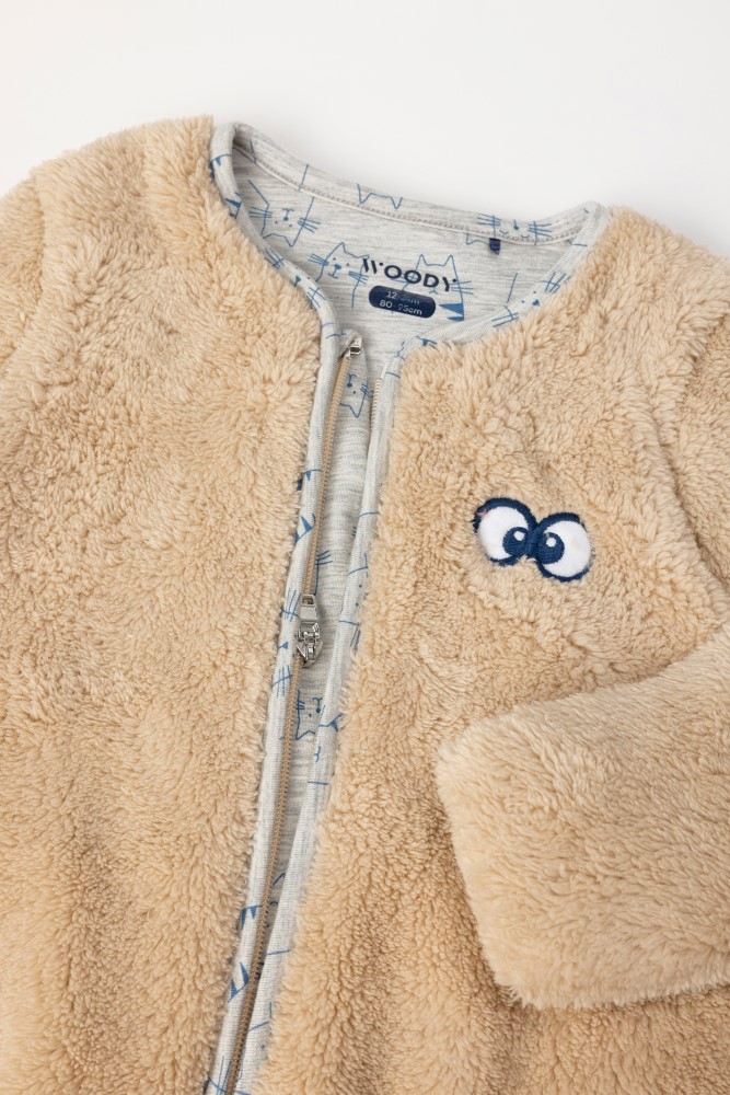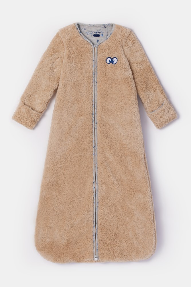 Beige slaapzak voor baby's van teddystof met rits en oogjes op de borst. De slaapzak is 70cm-110cm en heeft een TOG-waarde van 2.5.