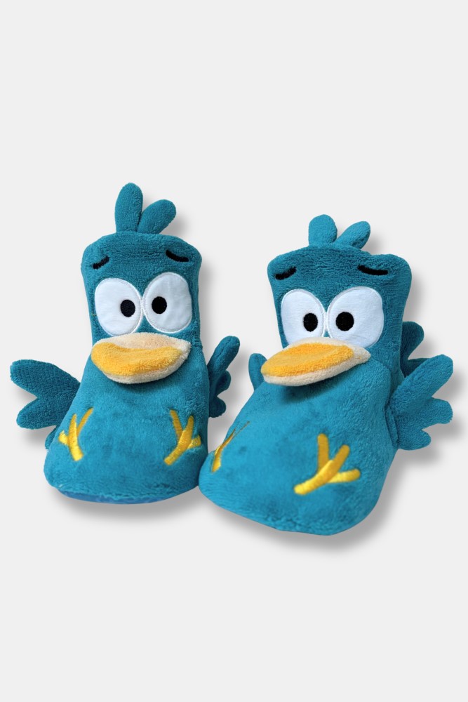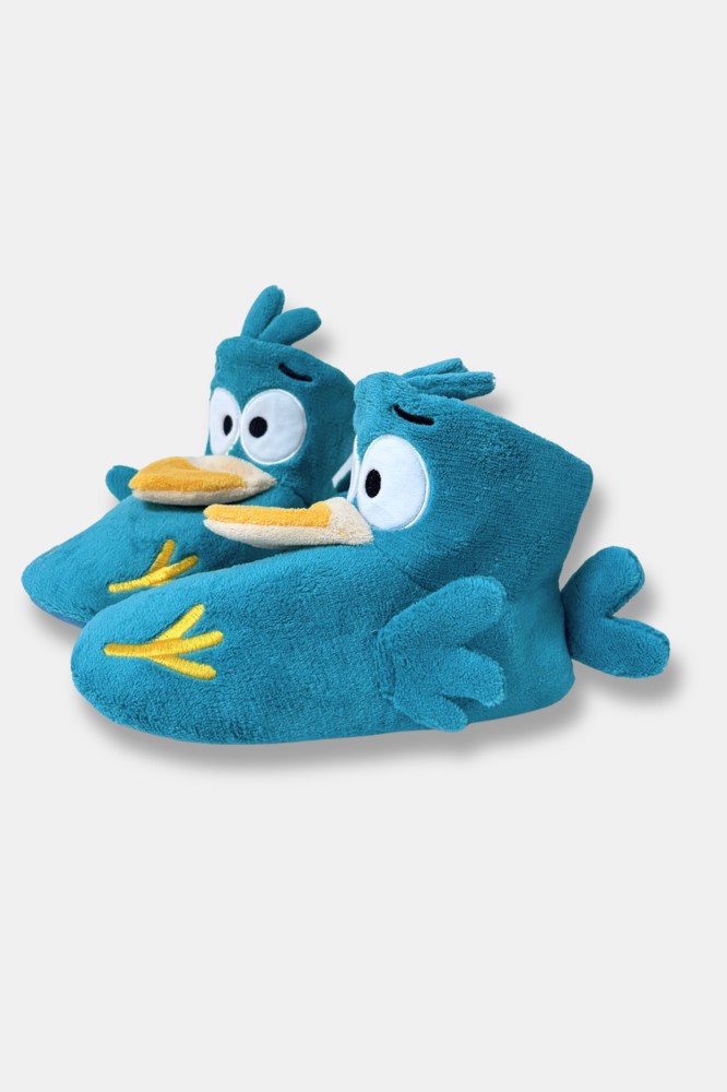 Deze blauwe pantoffels van fleece hebben een ontwerp in de vorm van een duif met ogen, vleugels en opvallende snavel. Ze bieden warmte en comfort binnenshuis. Verkrijgbaar voor kinderen en volwassenen in de maten 22-26 tot 43-46.