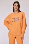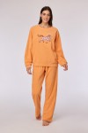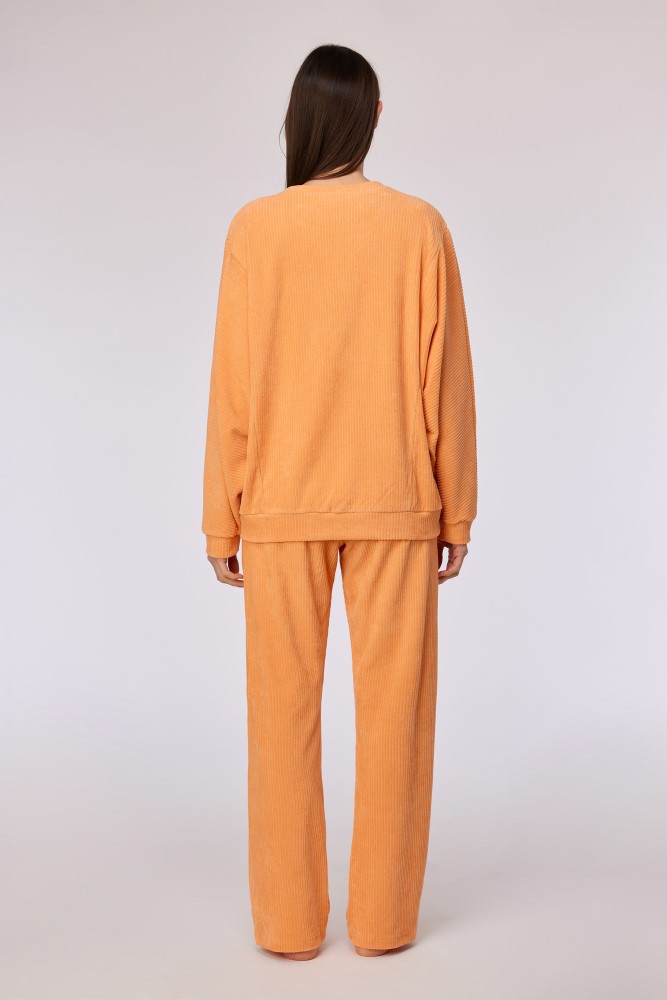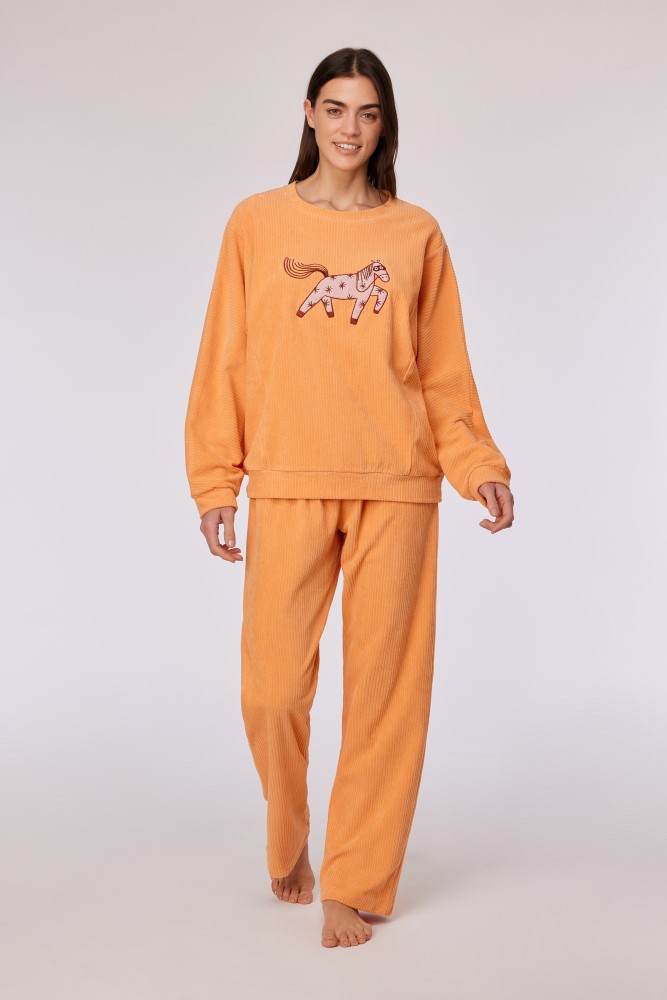 Pyjama van zacht oranje ribvelours. De brede broek zit los en comfortabel - net als de trui, die dankzij de brede aangestikte zijpanden vleermuismouwen krijgt. Op de trui staat een geborduurde print van een pony. Verkrijgbaar van 24m/2y-XXL. Voor de maten 2y-8y is er een sluiting in de rug voorzien.