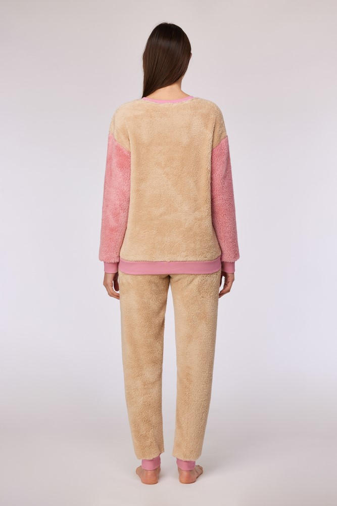 Beige set van teddystof. De set bestaat uit een sweatertrui en broek met rekker. De mouwen, hals en pijpuiteinden zijn roze. Op de sweater staat een kleine print van de kat. De set is verkrijgbaar in de maten 6m-XXL.