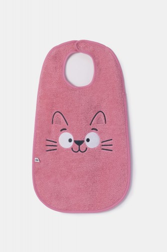 Grote roze slab van geweven badstof met kat. De slab meet 30x45 cm en is voorzien van drukknopen voor twee verschillende groottes.