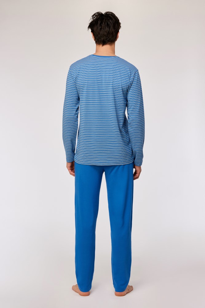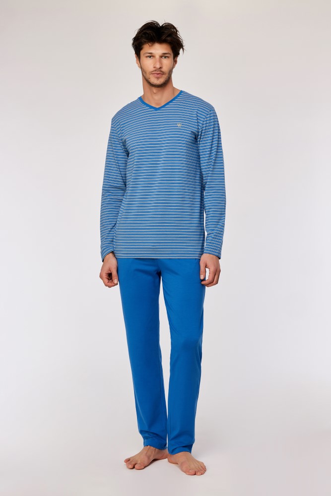 Blauwe pyjama van soepel katoen. Het bovenstuk is geel gestreept en heeft een V-hals. De broek is effen blauw. Verkrijgbaar in de maten S-XXL.