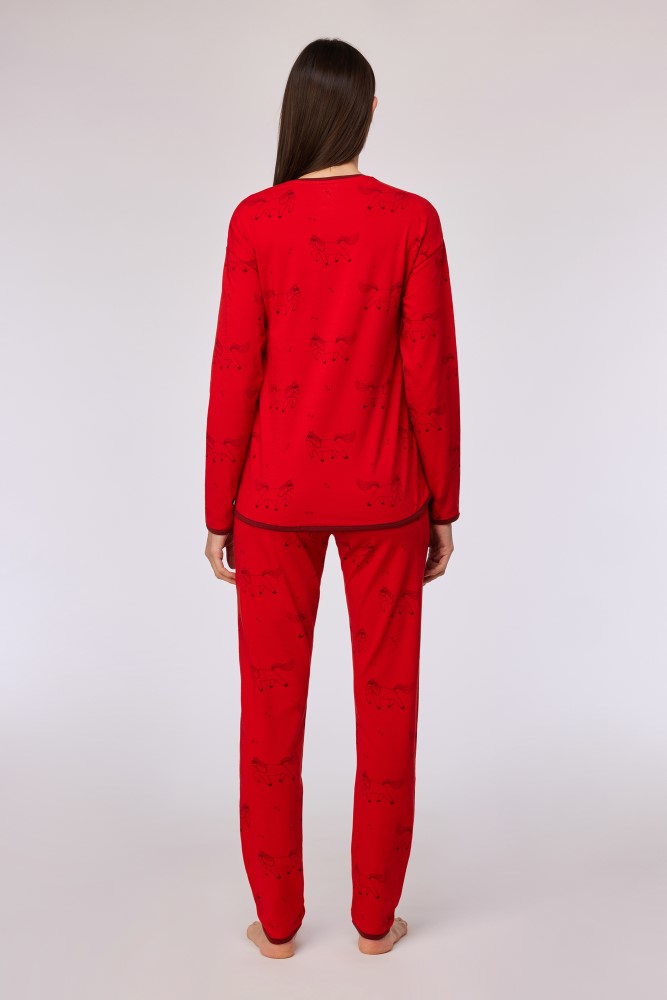 Rode pyjama van soepel katoen. De pyjama is volledig bedrukt met een ponyprint, zowel op het bovenstuk als op de broek. Verkrijgbaar in de maten 24m/2y-XXL. Voor de maten 0m-8y is er een sluiting in de rug voorzien.