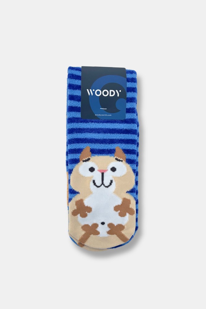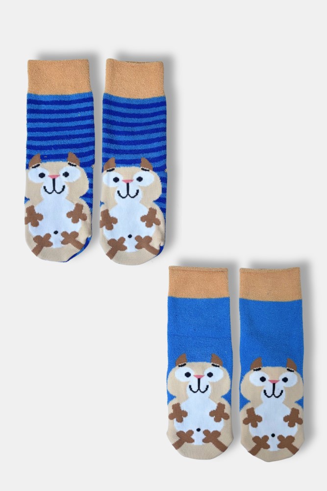 Set van twee paar sokken van fijn breiwerk. Ze hebben allebei een kattenprint en gele boord. Een paar heeft blauwe strepen, het andere paar is effen blauw. Verkrijgbaar in de maten 23-29 tot 42-46.