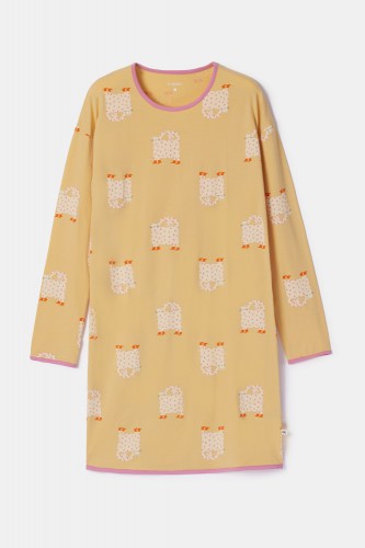 Geel slaapkleedje met kattenprint van soepel katoen. Verkrijgbaar in de maten 24m/2y-XXL.