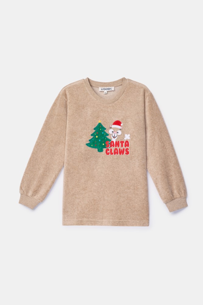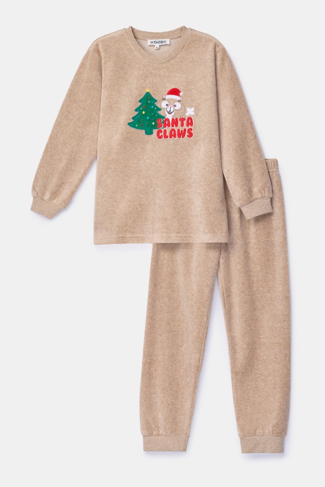 Woody pyjama van ultrazachte beige velours. De effen beige trui met lange mouwen met speelse kattenprint wordt gecombineerd met een effen lange broek. Deze warme pyjama zit los en comfortabel, de mouwen en broek zijn afgewerkt met een brede boord. Verkrijgbaar van maat 2 jaar t.e.m. maat XXL, perfect om te matchen tijdens deze eindejaarsfeesten.