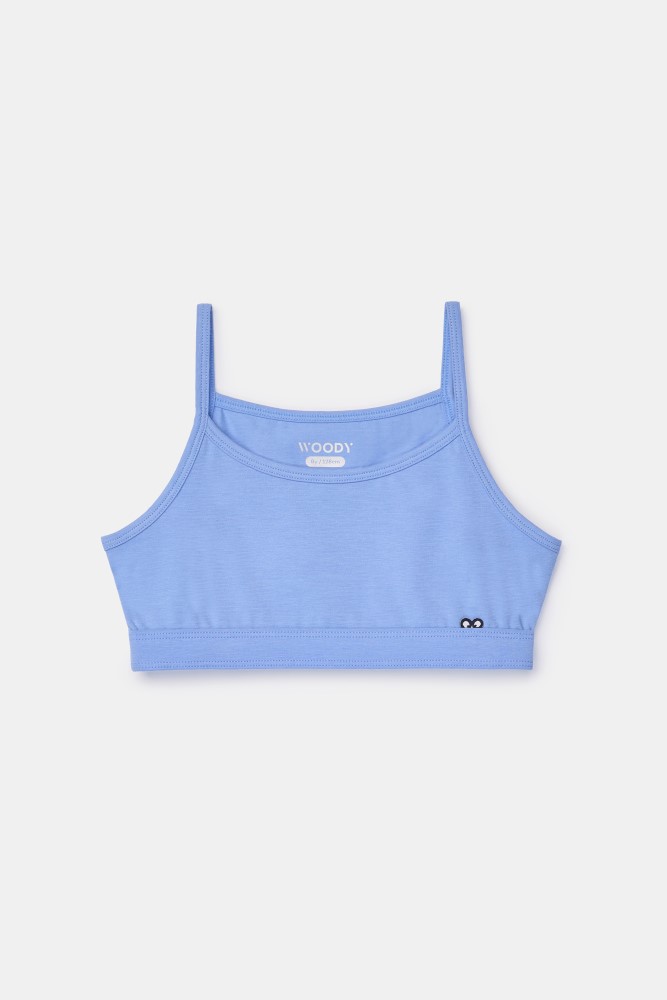 Blauw kort topje van rekbaar katoen. Het topje heeft spaghettibandjes, is afgewerkt met een stretch boord onderaan. Verkrijgbaar in maten 2Y-16Y.