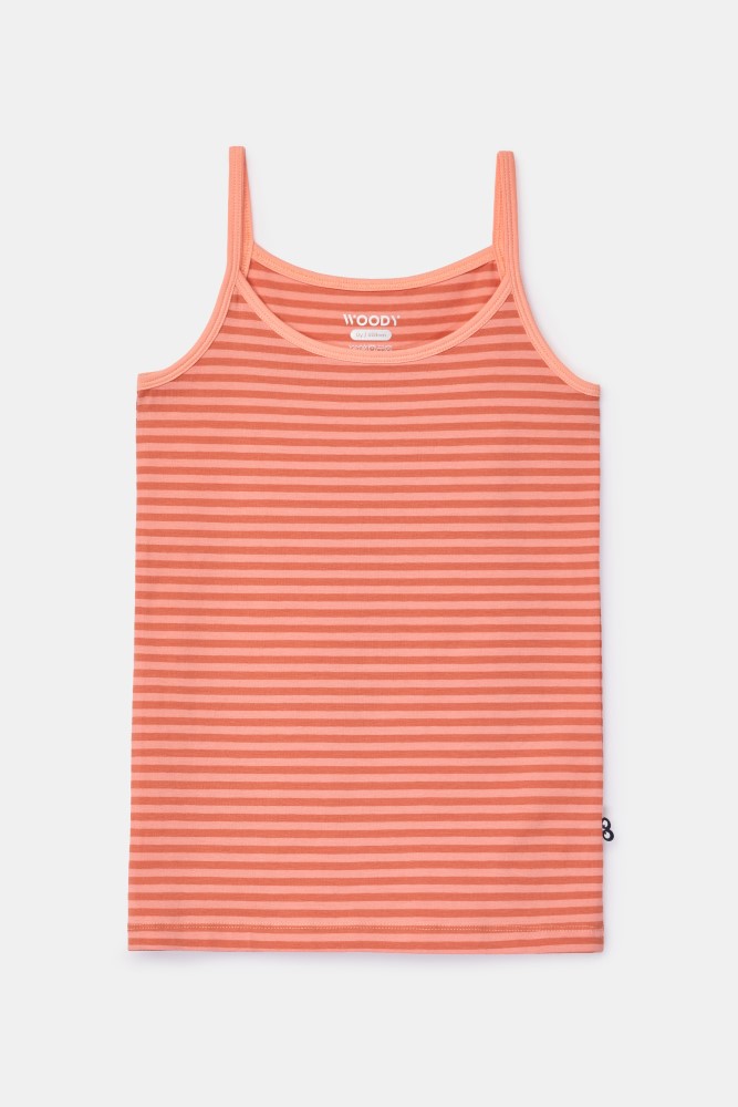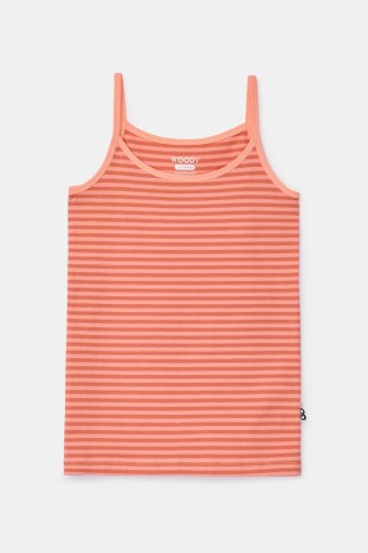 Perzikoranje gestreepte Woody singlet met spaghettibandjes voor meisjes in soepel en rekbaar katoen. Verkrijgbaar in maten 2Y-16Y.