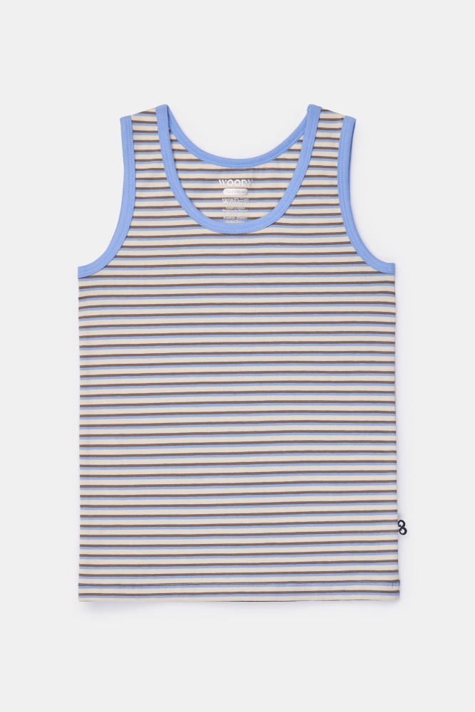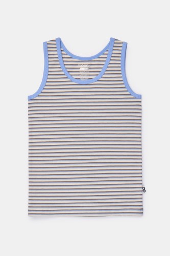 Bruin-blauw gestreepte Woody singlet voor jongens in soepel en rekbaar katoen. Verkrijgbaar in maten 2Y-16Y.