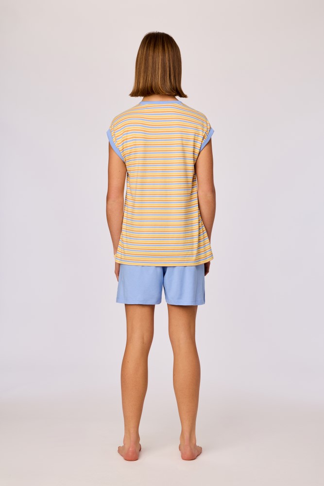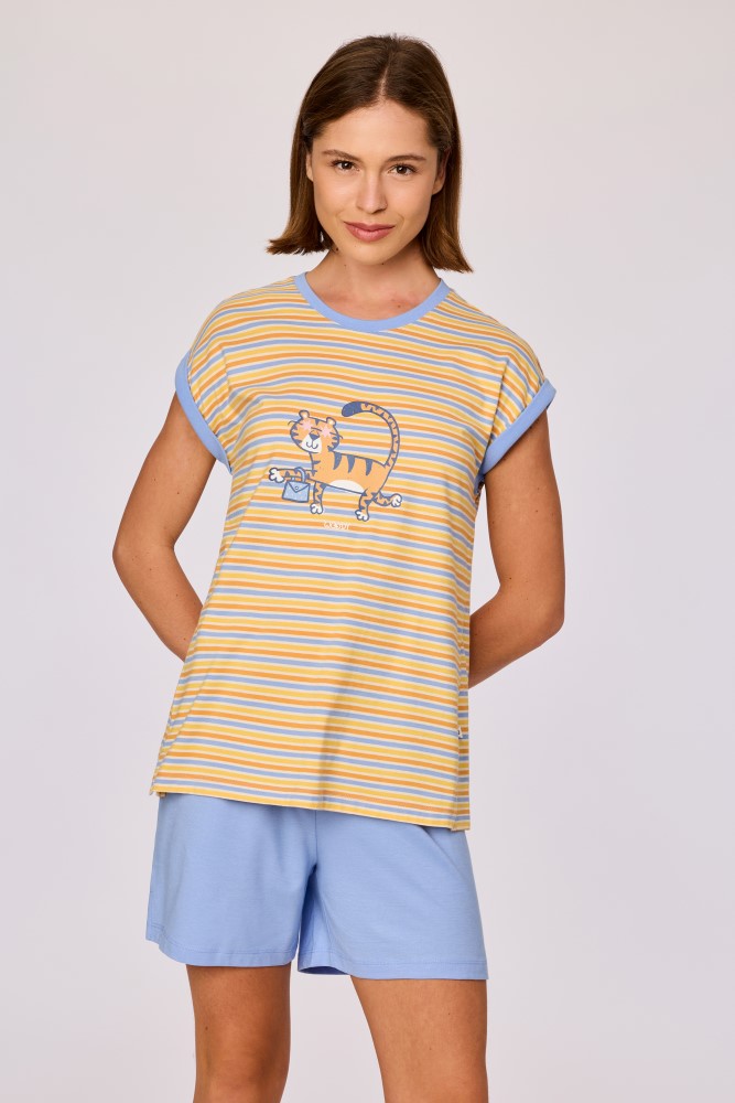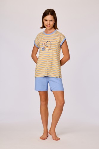 Kleurrijk gestreepte pyjama voor meisjes en dames van soepel katoen. Het gestreepte bovenstuk heeft korte mouwen en een grote kat als print. De pyjama wordt gecombineerd met een blauwe effen short. Verkrijgbaar in maten 3M-XXL.