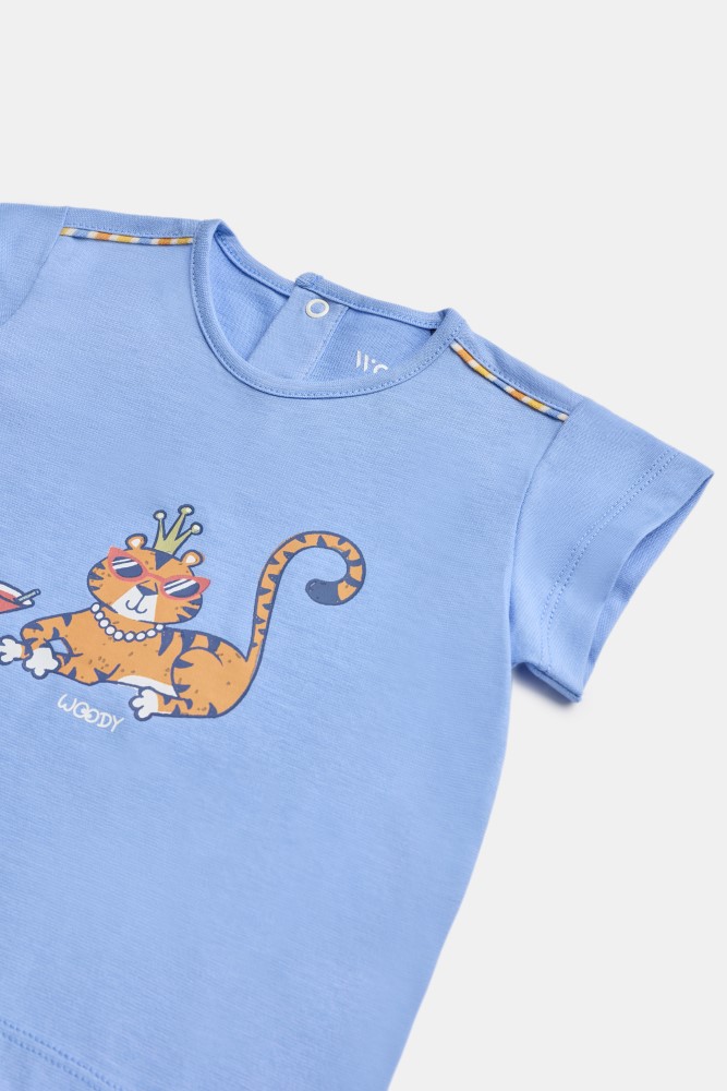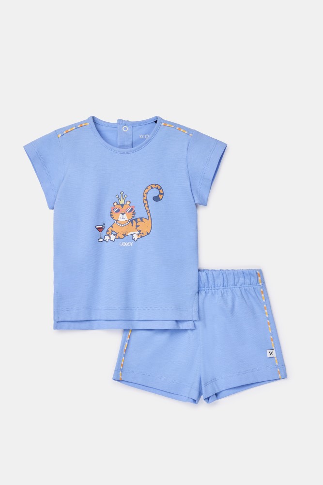 Deze blauwe pyjama van soepel katoen heeft een T-shirt met korte mouwen en een vrolijke print van een tijger met zonnebril. De schouders zijn afgewerkt met een kleurrijk detail dat mooi aansluit bij de print. De short heeft een comfortabele elastische taille en kleurrijke accenten langs de zijnaden. Dankzij de soepele katoenkwaliteit voelt deze pyjama licht en luchtig aan.