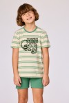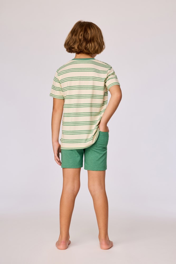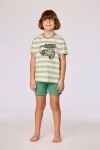 Jongens en heren pyjama van soepel katoen. Het groen gestreepte bovenstuk valt op door de grote vrolijke kameleonprint. Het bovenstuk wordt gecombineerd met een effen groene short. Verkrijgbaar in de maten 3M-XXL.