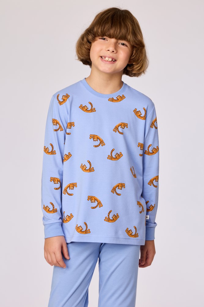 Tweedelige jongens en heren pyjamaset van soepel katoen. De blauwe T-shirt heeft een ronde hals, lange mouwen en een all over print met springende tijgers. De broek is uitgevoerd in effen blauw en voorzien van een elastische tailleband. Zowel de mouwen als de broekspijpen zijn afgewerkt met boorden. Beschikbaar in de maten 3m-XXL.