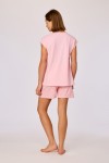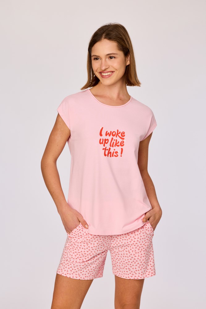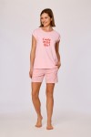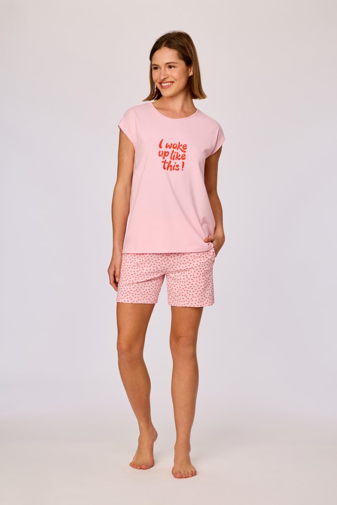 Deze roze pyjama van soepel katoen bestaat uit een lichtroze T-shirt met korte mouwen en een ronde hals, afgewerkt met een centrale rode tekstprint op de voorzijde voor de maten 12Y-XXL. Voor de maten 2Y-10Y is dit een kleine vlinder. De bijpassende short is uitgevoerd met een all over rood strikjesmotief en een elastische tailleband. Verkrijgbaar in de maten 2Y-XXL.
