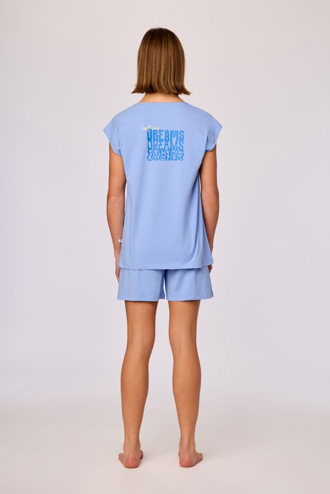 Deze blauwe pyjama van soepel katoen bestaat uit een blauwe T-shirt met korte mouwen en een ronde hals, afgewerkt met een kleine tijger op de borst voor de maten 2Y-10Y. Bij de maten 12Y-XXL is de T-shirt afgewerkt met een grote tekstprint op de rug. Debijpassende short is effen blauw en uitgevoerd met een elastische tailleband. Verkrijgbaar in de maten 2Y-XXL.