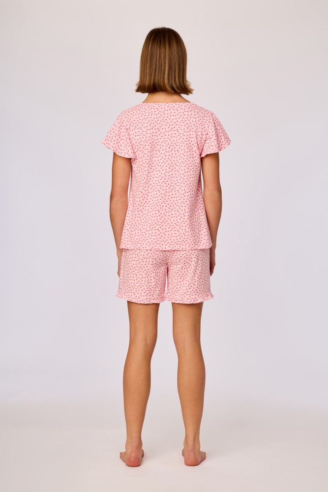 Tweedelige set van soepel katoen voor meisjes en dames. De roze set heeft een all over strikjesprint en bestaat uit een T-shirt met korte aangeknipte mouwen en een V hals. De short is voorzien van een elastische tailleband en een subtiele rucherand. Beschikbaar in de maten 12Y-XXL.