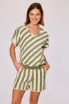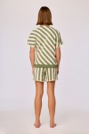 Groen-ecru gestreepte set van badstof. Het bovenstuk heeft een V hals, korte mouwen met een licht afgewerkte boord en een opgestikte borstzak aan de linkerzijde. De short is voorzien van een elastische tailleband en rechte, korte pijpen met eenzelfde afgewerkte rand. Verkrijgbaar in maten XS-XXL.