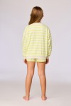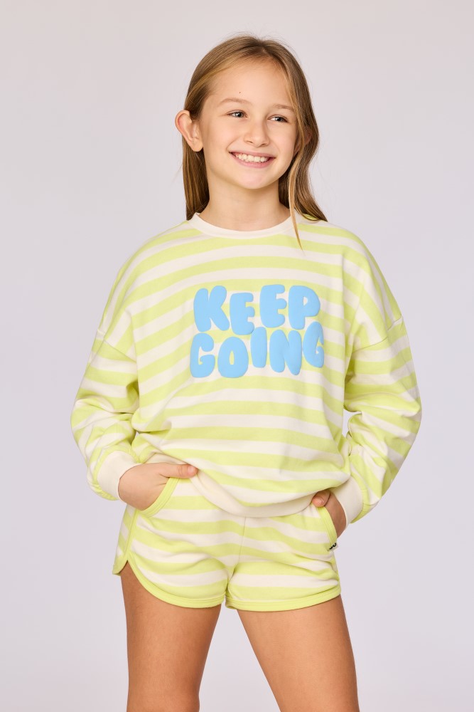 Ecru-geel gestreepte sweater van 100% katoen. De sweater heeft een print met opschrift 'Keep going' en is afgewerkt met ecru details. De sweater heeft een comfortabele pasvorm. Verkrijgbaar in maten 2Y-12Y.
