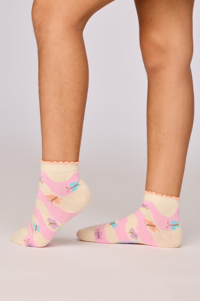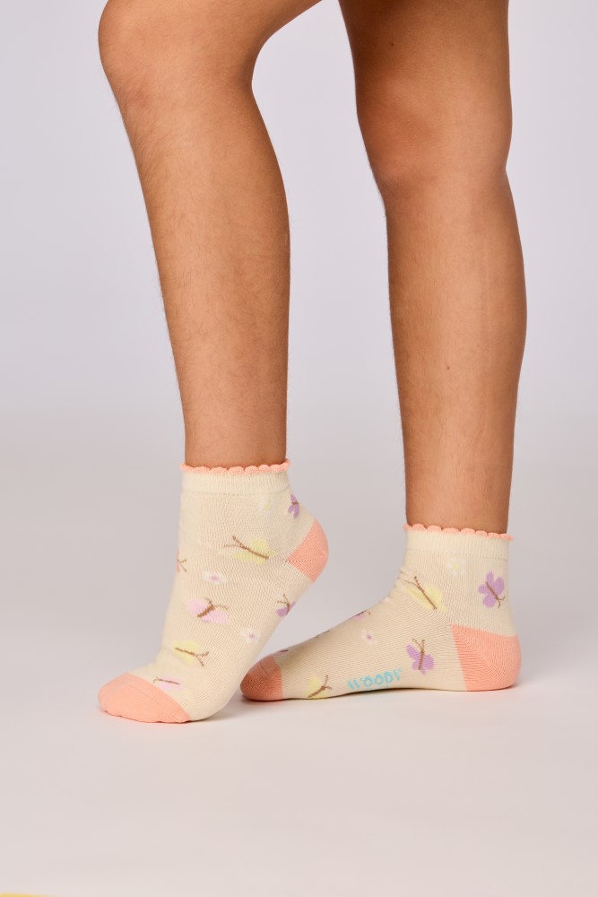 Kleurrijke set van twee paar korte sokken van fijn katoen. Beide sokken hebben een vlinderprint. Verkrijgbaar in de maten 0-6m tot 43-46.
