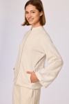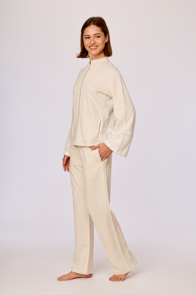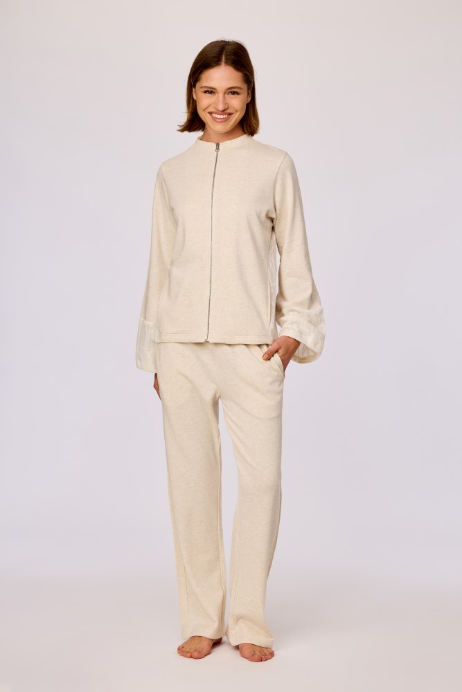 Deze dames homewear set bestaat uit een vest met ritssluiting en een bijpassende lange broek. De set is uitgevoerd in een effen lichte beige kleur met een zachte en gelijkmatige stofstructuur. Het vest heeft een rechte pasvorm en is voorzien van een ronde hals. De sluiting aan de voorzijde bestaat uit een doorlopende ritssluiting. De lange mouwen zijn wijd uitgevoerd en afgewerkt met een contrasterende inzet aan de onderzijde van de mouw. Het vest is recht afgewerkt aan de zoom.