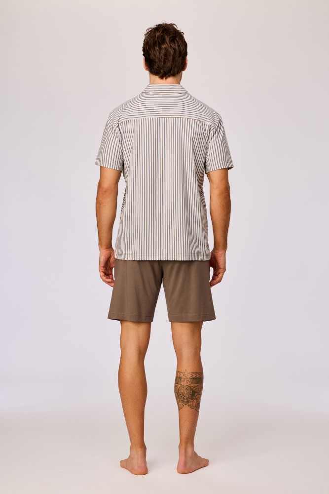 Deze heren pyjamaset bestaat uit een bruin-blauw gestreepte shirt met korte mouwen en een bijpassende bruine short . Het shirt is voorzien van een kraag, een knoopsluiting aan de voorzijde en een borstzak. De short heeft een elastische tailleband. Verkrijgbaar in de maten S-XXL