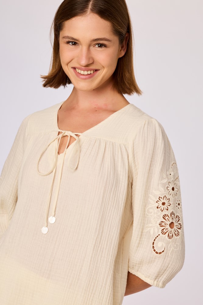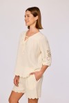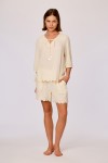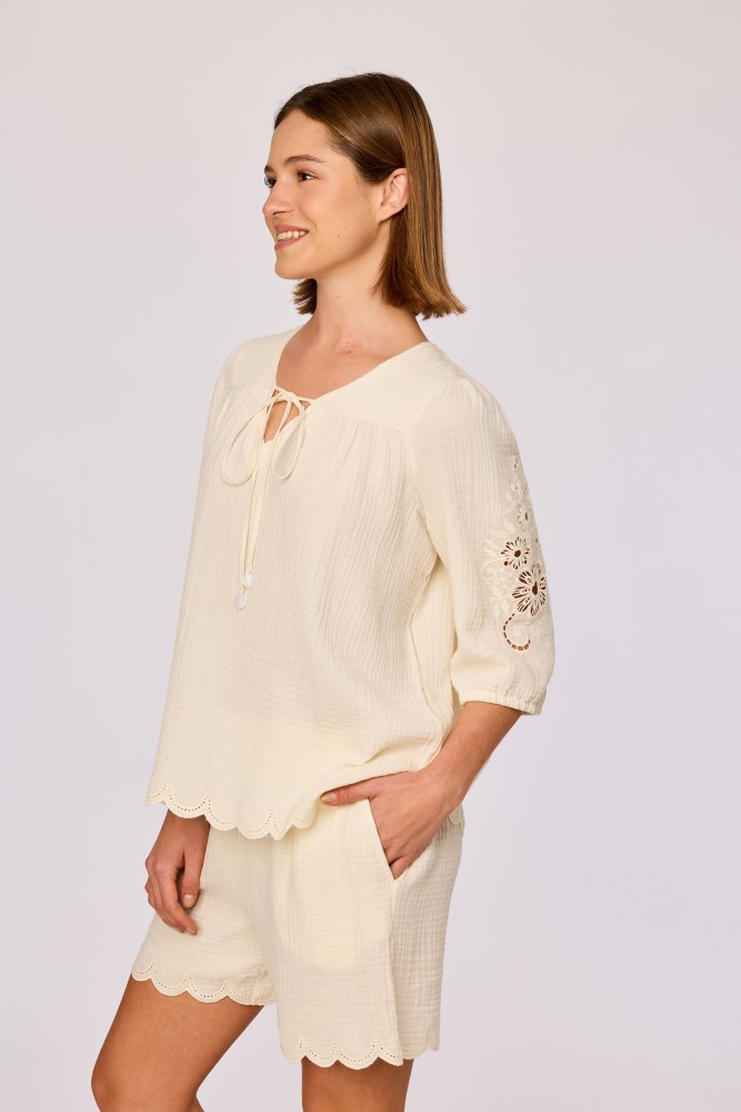 Ecru dames set van geweven katoen. De blouse heeft een ronde hals met een smalle V opening en een striksluiting aan de voorzijde. De mouwen zijn driekwart lengte en afgewerkt met geborduurde bloemen details. De stof heeft een licht gestructureerd oppervlak en is licht doorschijnend. De onderzijde van de blouse is afgewerkt met een geschulpte rand. De bijpassende short heeft een rechte pasvorm met een elastische tailleband. De pijpen zijn afgewerkt met een geschulpte zoom die aansluit bij de afwerking va