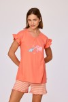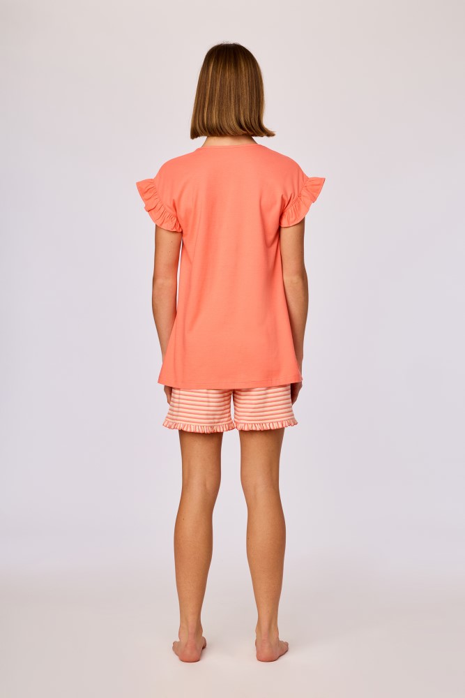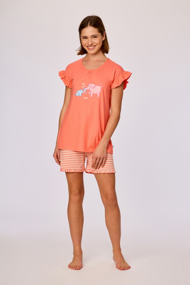 Meisjes en dames pyjama van soepel katoen met uitwaaierende mouwen. Het koraalrode effen bovenstuk valt op door de grote vrolijke glow-in-the-dark olifantenprint. Het bovenstuk wordt gecombineerd met een kleurrijk gestreepte short, dat onderaan afgewerktis met een aangestikte frons. Verkrijgbaar in de maten 3M-XXL.