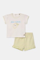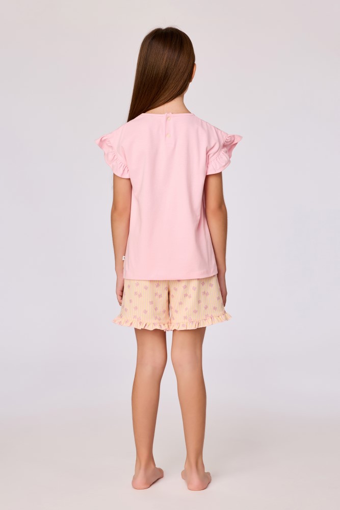 Meisjes en dames pyjama van soepel katoen met uitwaaierende mouwen. Het lichtroze effen bovenstuk valt op door de grote vrolijke print met opschrift 'I woke up like this'. Het bovenstuk wordt gecombineerd met een kleurrijk gestreepte short met vlinderprint, dat onderaan afgewerkt is met een aangestikte frons. Verkrijgbaar in de maten 3M-XXL.