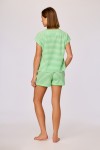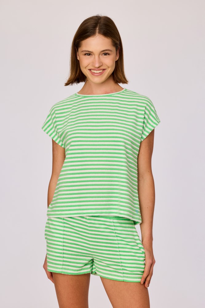 Tweedelige set van groen-wit gestreepte Terry badstof. De strandshort kan aangespannen worden met een striklint. Verkrijgbaar in maten 2Y-XXL.