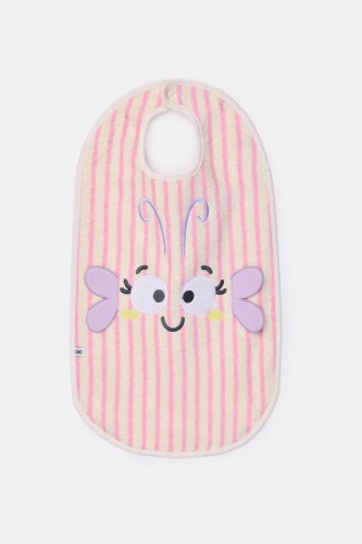 Groot roze-wit gestreept slabbetje van badstof met vlinderprint. Deze praktische slab sluit door middel van 2 drukknopen (2 verschillende standen mogelijk). Perfect voor dagelijks gebruik. Formaat 30 x 45cm.