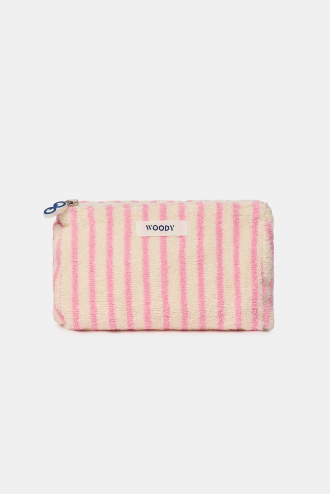 Roze-wit gestreept zakje van badstof Gebruik het als toiletzak of pennenzak. Formaat 7x13cm.