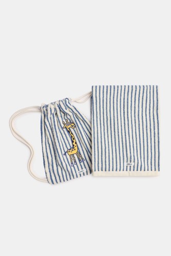 Blauw-wit gestreept strandlaken van badstof. Wordt geleverd in een bijpassende zwemzak van badstof met geborduurde giraf. Formaat handdoek 70cm x 140cm.